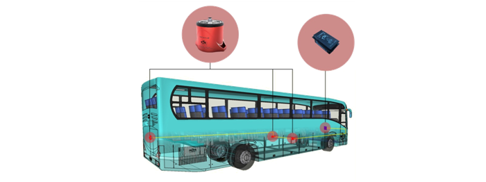 設(shè)計(jì)案例:江西百路佳新能源6.5米長(zhǎng)客車(chē),內(nèi)有電池艙5個(gè),故需設(shè)計(jì)的保護(hù)區(qū)為5個(gè)保護(hù)區(qū),每個(gè)保護(hù)區(qū)配置1臺(tái)自動(dòng)滅火裝置(型號(hào)QRR0.03GW/SHS-AR23ZF),5個(gè)保護(hù)區(qū)內(nèi)的5臺(tái)裝置通過(guò)總承線(xiàn)束和駕駛員操作盤(pán)上的模塊聯(lián)接。
