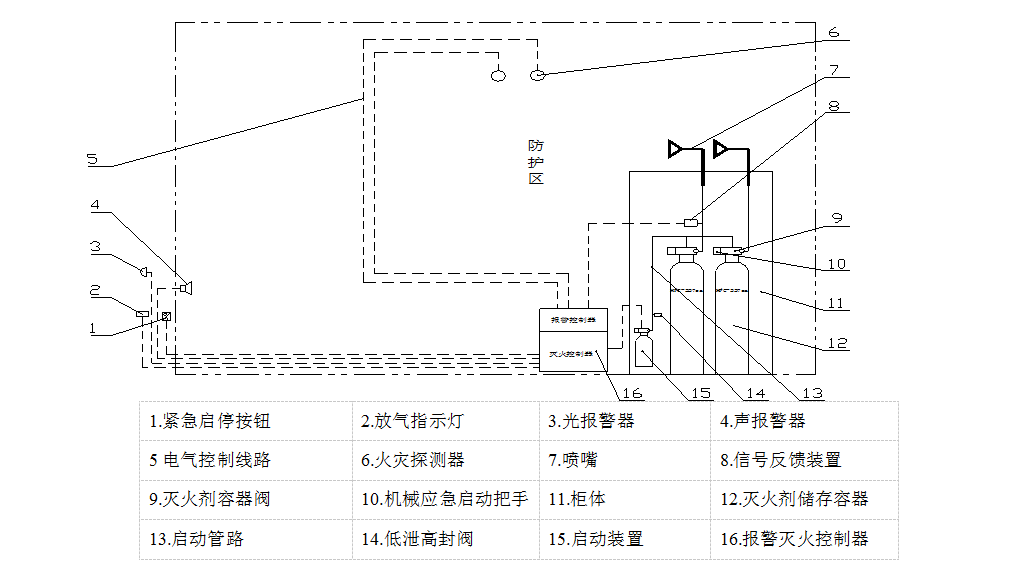 ● 該裝置的啟動方式為自動控制、手動控制和機械應急手動控制三種。一般情況下應使用手動控制,在防護區(qū)無人的情況下可以轉(zhuǎn)換為自動控制,當自動控制和手動控制不能執(zhí)行時,應采用機械應急手動控制。